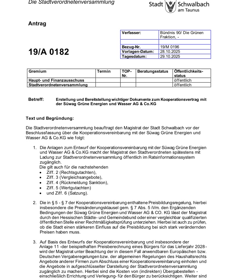 Antrag 19/A0182 – Erstellung und Bereitstellung wichtiger Dokumente zum Kooperationsvertrag mit Süwag