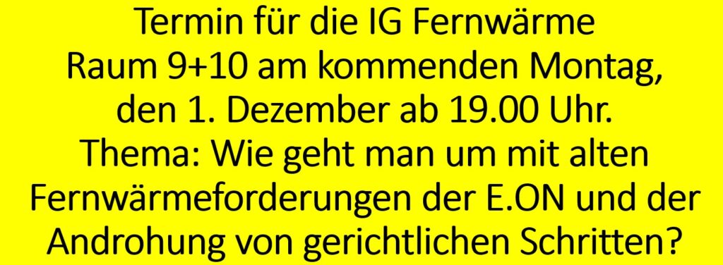 Termin IG Fernwärme Raum 9+10 am kommenden Montag, den 1. Dezember ab 19.00 Uhr.
